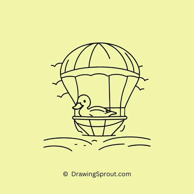 Imagine a duck riding in a small hot air balloon above the pond. Outline a round body and amazed eyes. Sketch the balloon with billowing fabric and ropes, adding a sense of adventure to the scene.