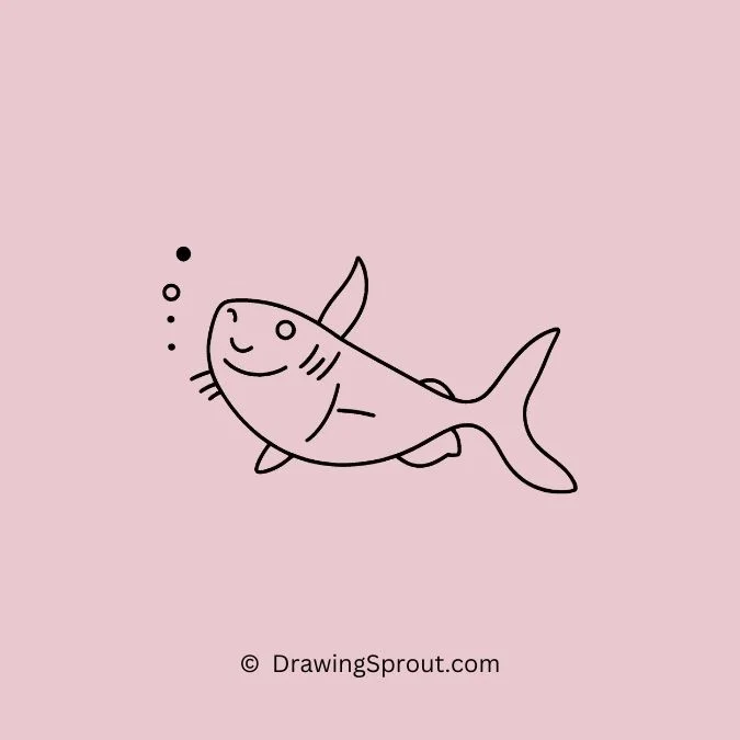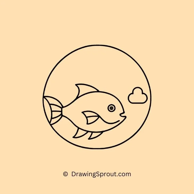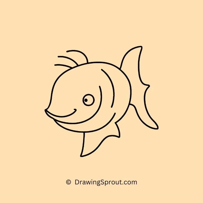 Draw a simple fish with a big smile. Start with an oval shape for the body, add a triangle for the tail, and give it a wide, cheerful grin. Add simple curved lines for fins and small circles for bubbles around it.