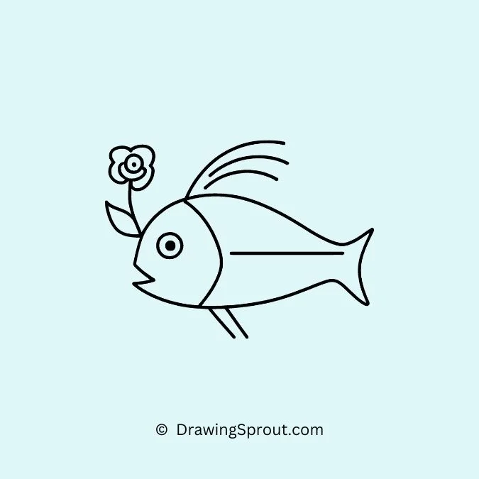 Sketch a fish holding a flower in its mouth. Create a basic fish outline and add a small flower, giving the fish a gentle touch. Draw the flower with a simple round center and petals radiating outwards.