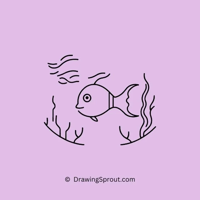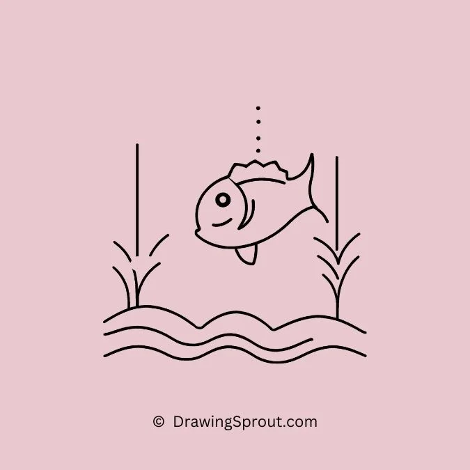 Create a scene with a fish swimming happily in a pond. Sketch a basic fish and add ripples and water plants around it. Draw small waves around the fish to show it’s moving through the water.