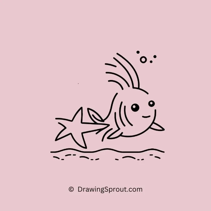 Sketch a fish with a starfish friend beside it. Outline a basic fish shape and draw a starfish next to it, adding a touch of friendship. Use simple lines to create the starfishโs texture.