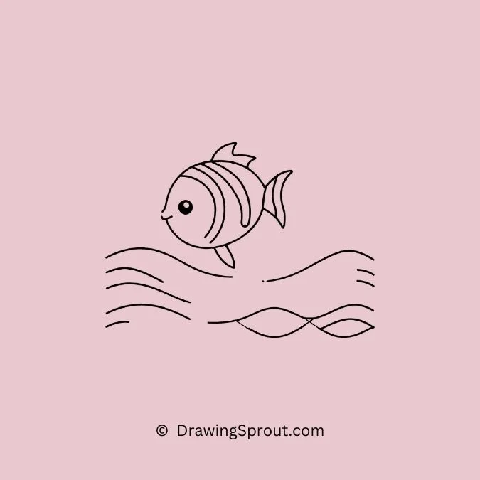 Illustrate a fish swimming through waves. Draw a simple fish shape and add wavy lines around it to depict water movement. Use flowing curves to create a sense of motion.