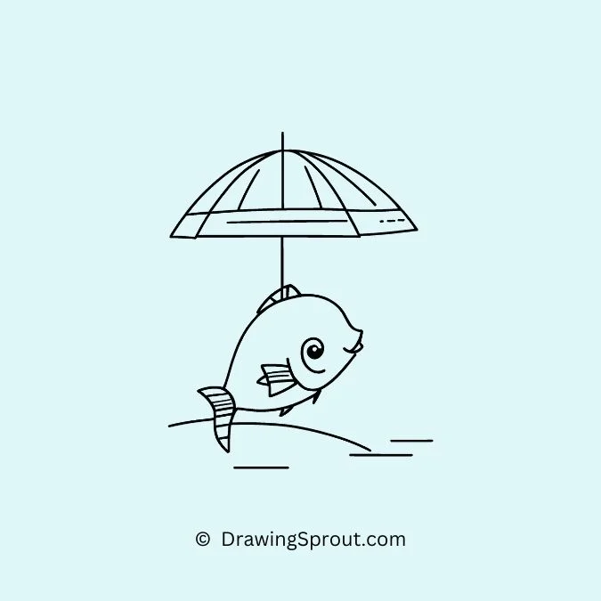 Illustrate a fish holding a tiny parasol. Draw a simple fish shape and add a small parasol above it, giving it a whimsical look. Use curved lines for the parasol and add a handle.