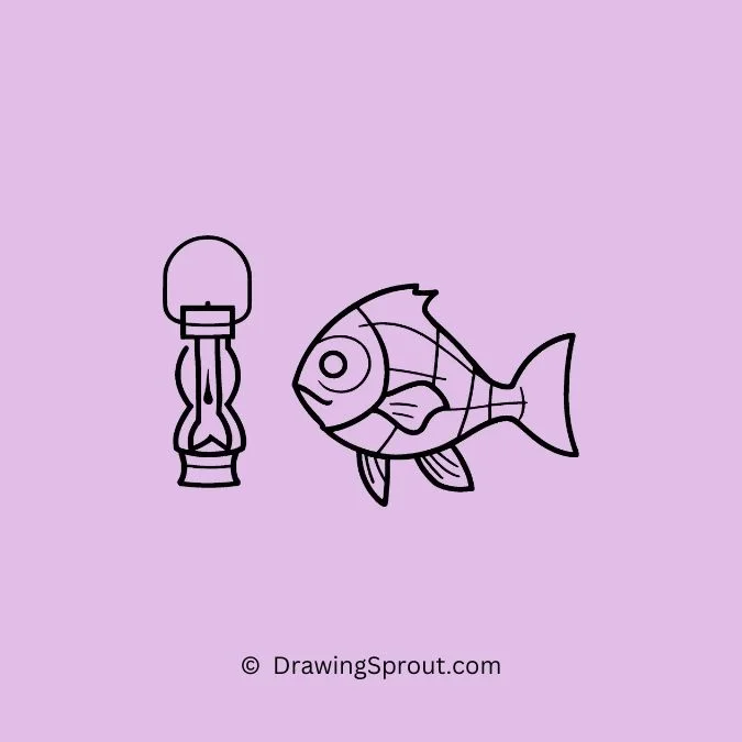 Illustrate a fish near a lighthouse. Draw a simple fish shape and add a lighthouse in the background, guiding its way. Use straight lines for the lighthouseโs structure.