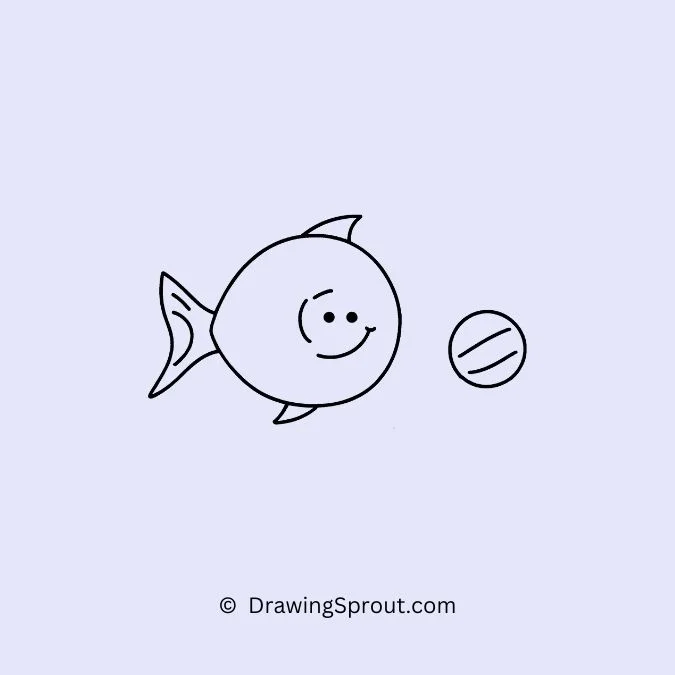 Illustrate a fish playing with a ball. Draw a basic fish shape and add a ball nearby, with motion lines indicating play. Use simple round shapes for the ball.