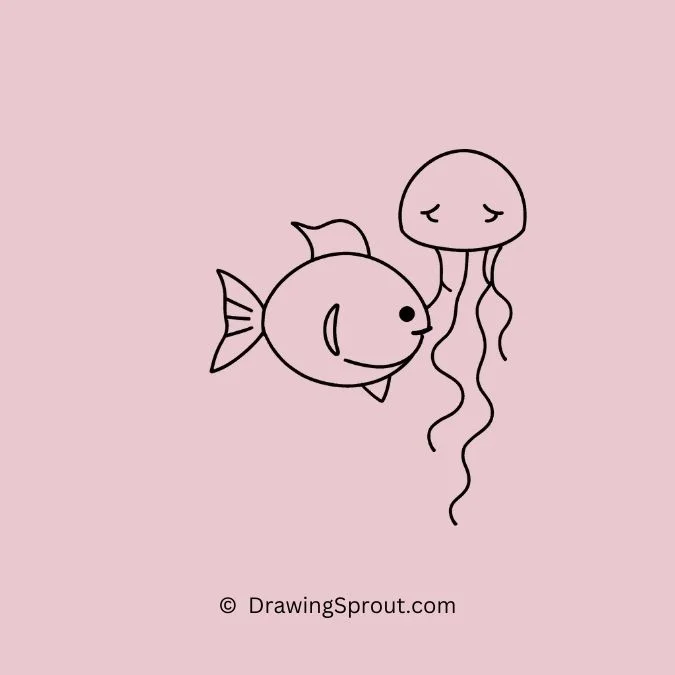 Draw a fish swimming alongside a jellyfish. Outline a simple fish shape and sketch a jellyfish with long tentacles. Use wavy lines for the tentacles and add some shading.
