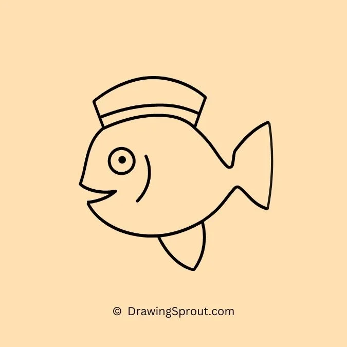 Sketch a fish wearing a pirate hat. Create a basic fish outline and add a small pirate hat, complete with a skull and crossbones. Use simple lines for the hatโs details.