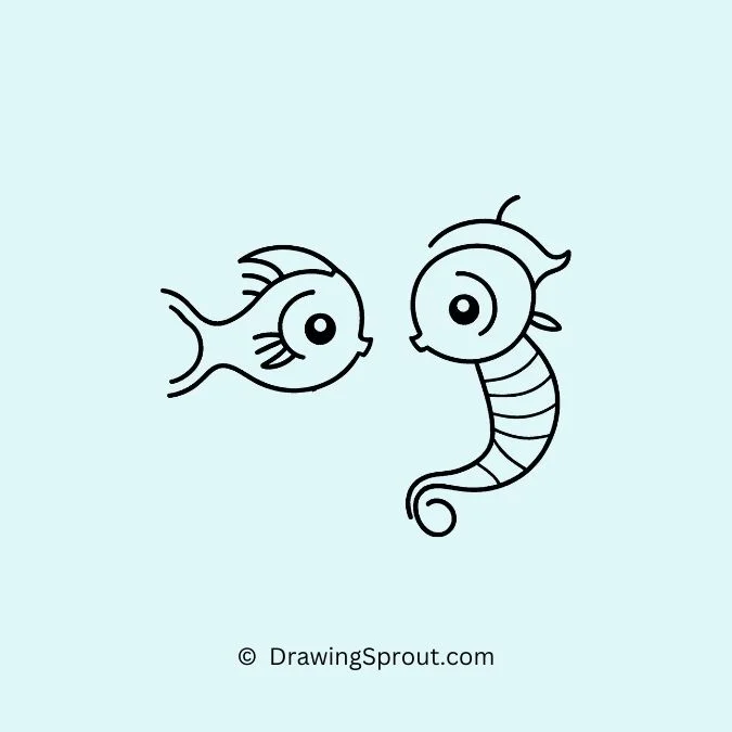 Draw a fish with a seahorse friend. Outline a simple fish shape and add a seahorse beside it, showcasing their underwater friendship. Use detailed lines for the seahorseโs texture.