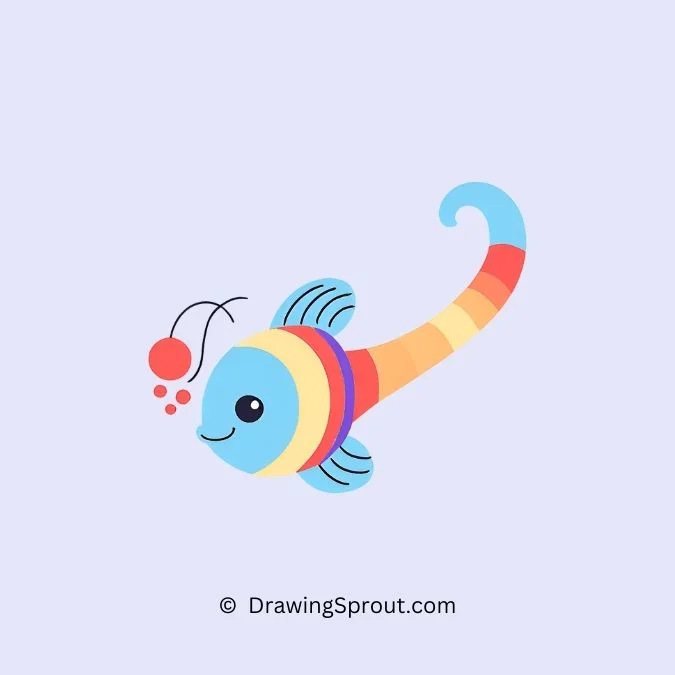 Draw a fish with a rainbow-colored tail. Start with a basic fish shape and add vibrant, multicolored stripes to its tail. Use bright colors to make the tail stand out.