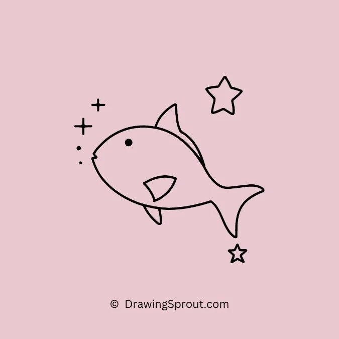 Draw a fish holding a star. Outline a basic fish shape and add a small star in its fin or mouth. Use simple lines to draw the star and add some sparkle.