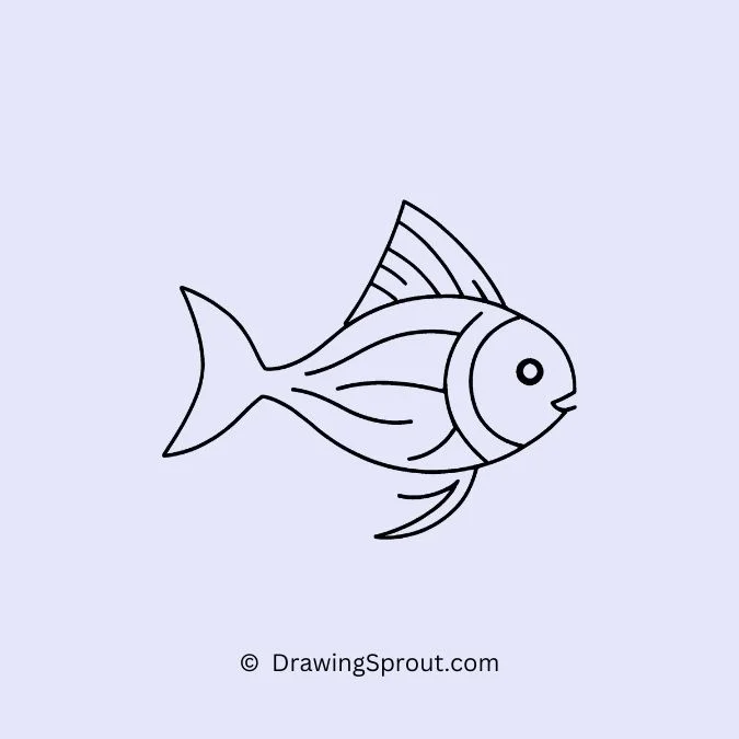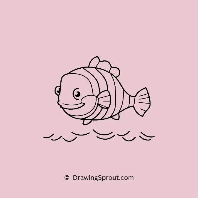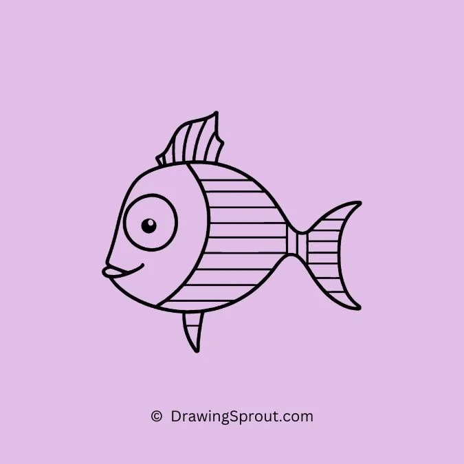 Draw a fish with bold, horizontal stripes. Outline a basic fish shape and add alternating stripes across its body. Make the stripes varying in thickness to add a playful look.