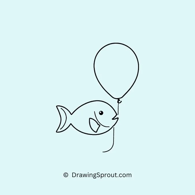 Illustrate a fish holding a balloon. Draw a basic fish shape and add a balloon tied to its fin. Use round shapes for the balloon and add a string.