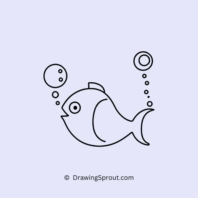 Sketch a fish swimming and blowing bubbles. Create a rounded body, and draw bubbles of various sizes trailing behind. Use light, circular strokes to draw the bubbles, and add small highlights to give them a 3D effect.