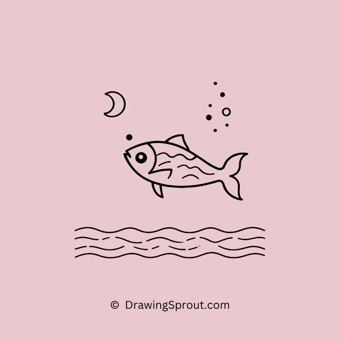 Draw a fish swimming under the moonlight. Outline a basic fish shape and add a moon in the background, with soft light reflecting on the water. Use gentle shading for the moonlight.