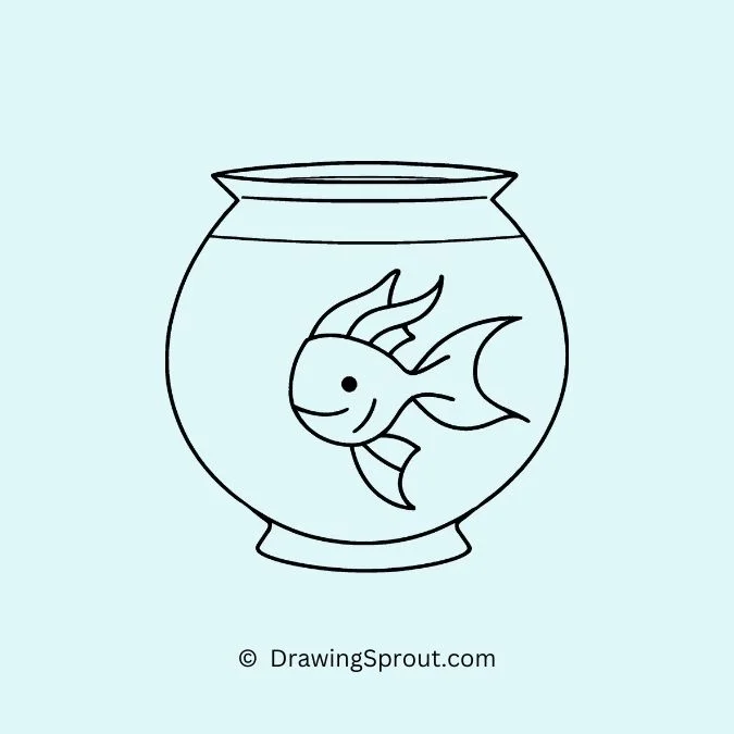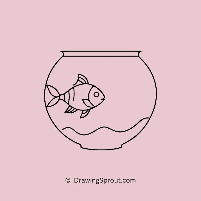 Draw a goldfish swimming gracefully in a round fishbowl. Outline the goldfish with flowing fins and a curved body. Add some pebbles and a tiny plant at the bottom of the bowl for a realistic touch. Use light, reflective lines on the bowl to show its glassy surface.