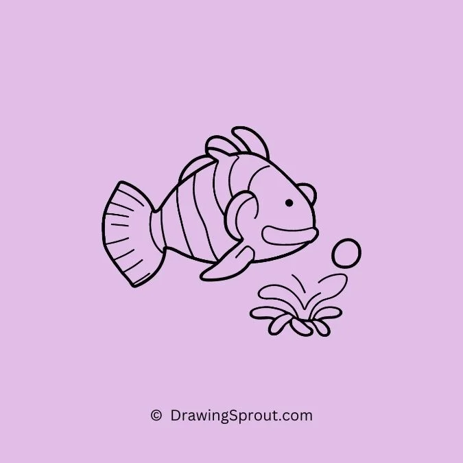 Draw a small, rounded body with distinctive white stripes across its orange surface. Make sure its eyes are big and expressive, with a happy smile. Add some wavy seaweed in the background to place your clownfish in its natural habitat.