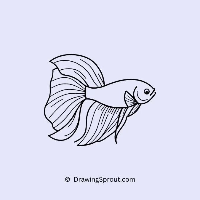 Create a stunning betta fish with its long, flowing fins spread out elegantly. Sketch an elongated body and add intricate details to the fins, using wavy lines to show their delicate texture. Add some water ripples around the fish to indicate its graceful swim.