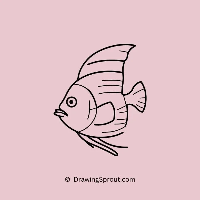 Draw an angelfish with its distinctive shape and bold vertical stripes. Outline the fish’s triangular body and add flowing, elegant fins. Use contrasting colors for the stripes to make them stand out and add a few bubbles around the fish for a lively touch.