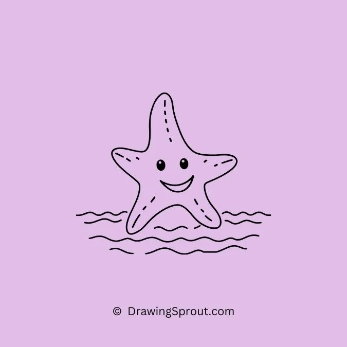 Draw a starfish resting on the seafloor with various sea elements around it. Start with the starfish’s characteristic star shape and add small dots and lines for texture. Surround it with pebbles, shells, and seaweed for a complete underwater scene.