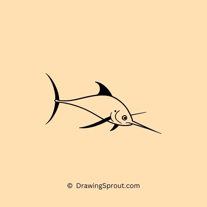 Draw a swordfish cutting through the water with its long, sharp bill. Outline a streamlined body and add the elongated bill at the front. Use curved lines to show the fish’s swift movement and add some bubbles trailing behind.