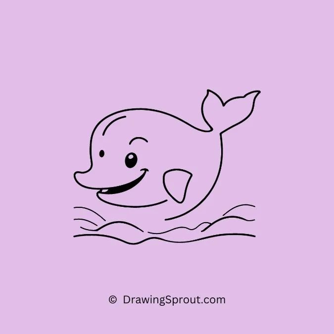 Sketch a playful dolphin with a large, round head and a curved body. Emphasize its big, cheerful eyes and wide smile. Add splashes of water around the dolphin to show its lively jump.