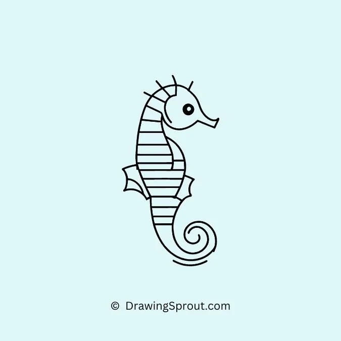 Sketch the seahorse with a curved, spiral tail and a horse-like head. Add small, delicate fins and textured body lines. Use flowing lines to create a sense of movement, making it look like it’s floating gently in the water.