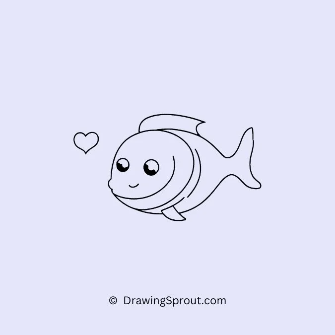 Draw a fish blowing a kiss. Create a simple fish shape, and add puckered lips and a small heart bubble. Make the fishโs lips rounded and add little lines around the heart bubble to show it’s floating.